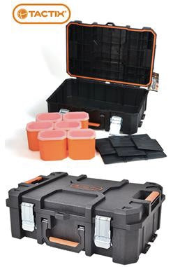 Caja porta herramientas metálica, plegable, pintura satinada negra, 3 bandejas interiores.